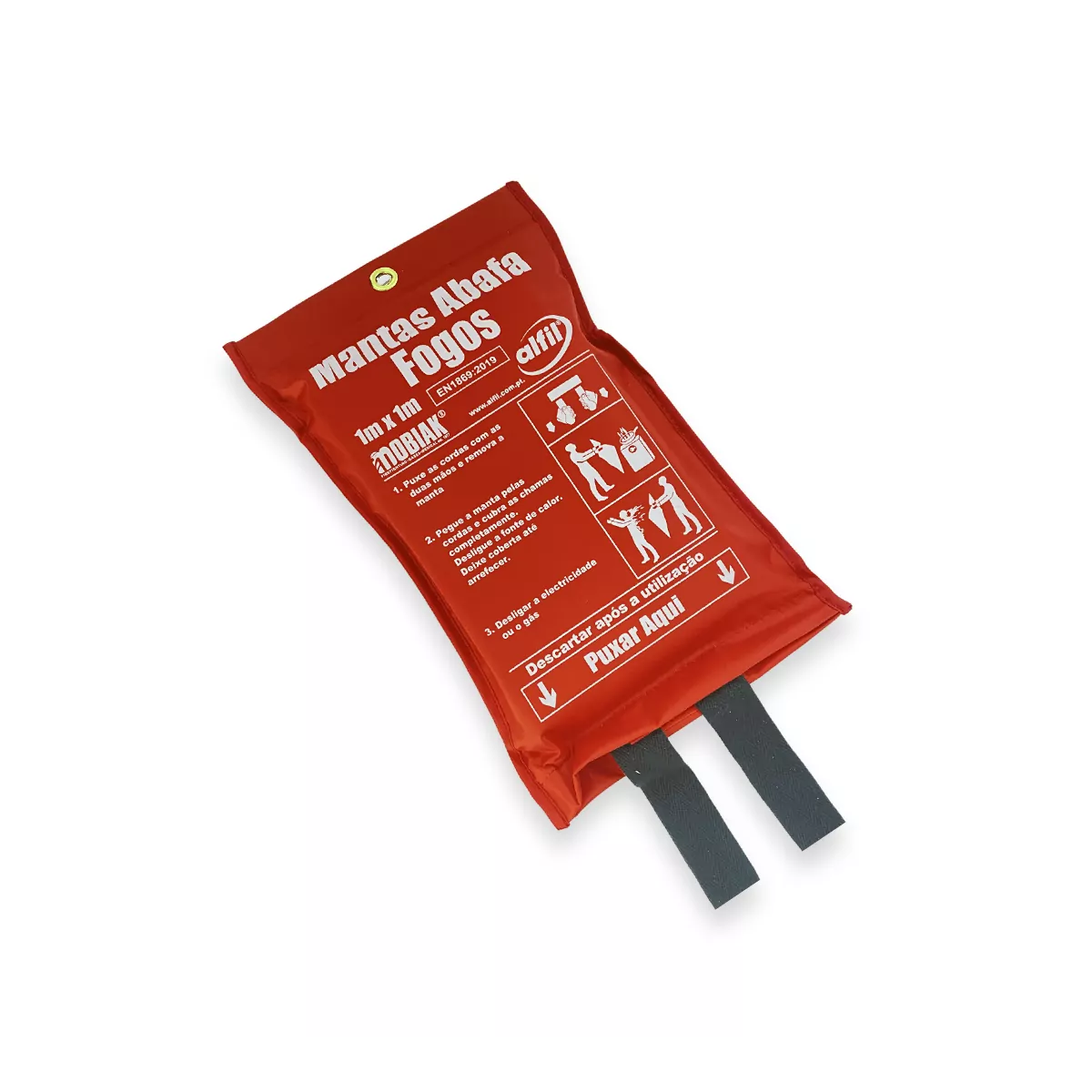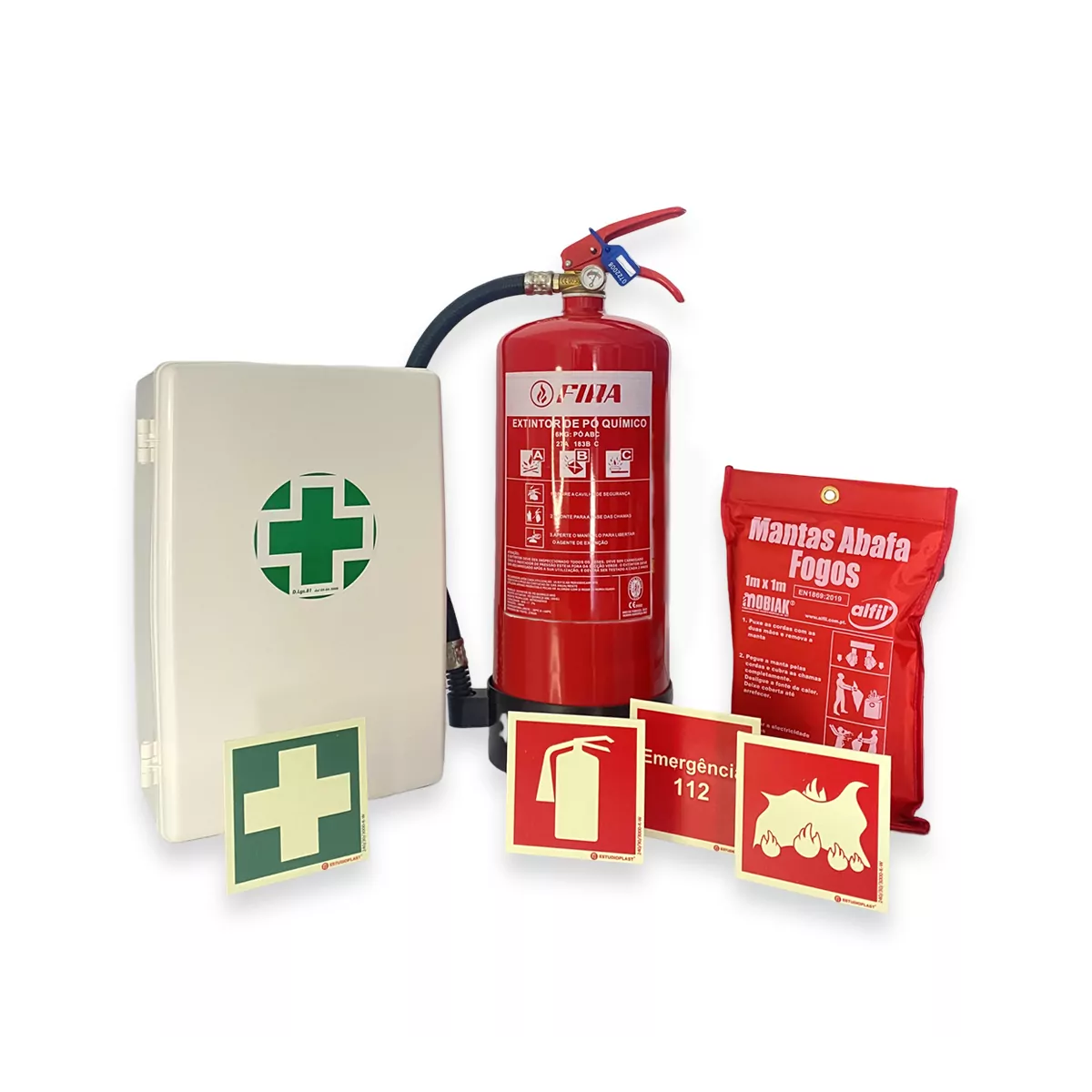 Segurança contra incêndio, com Manta Ignífuga 1.00 x 1.00 m (e sinalização correspondente), Extintor ABC 6Kg (e sinalização correspondente) e sinalização do número nacional de emergência (112).