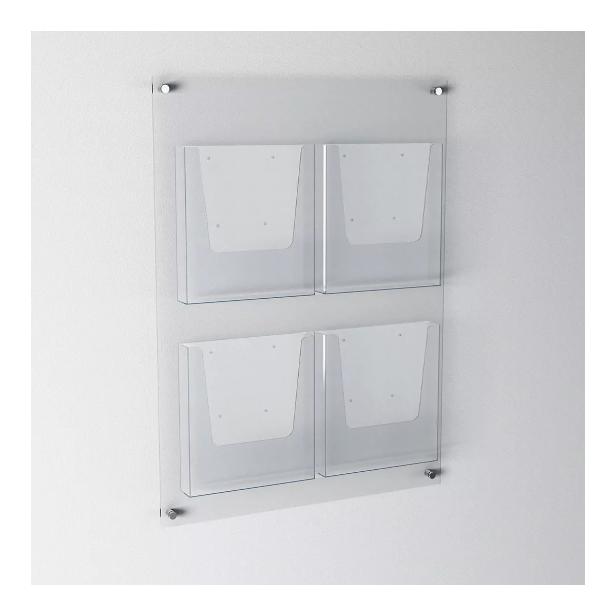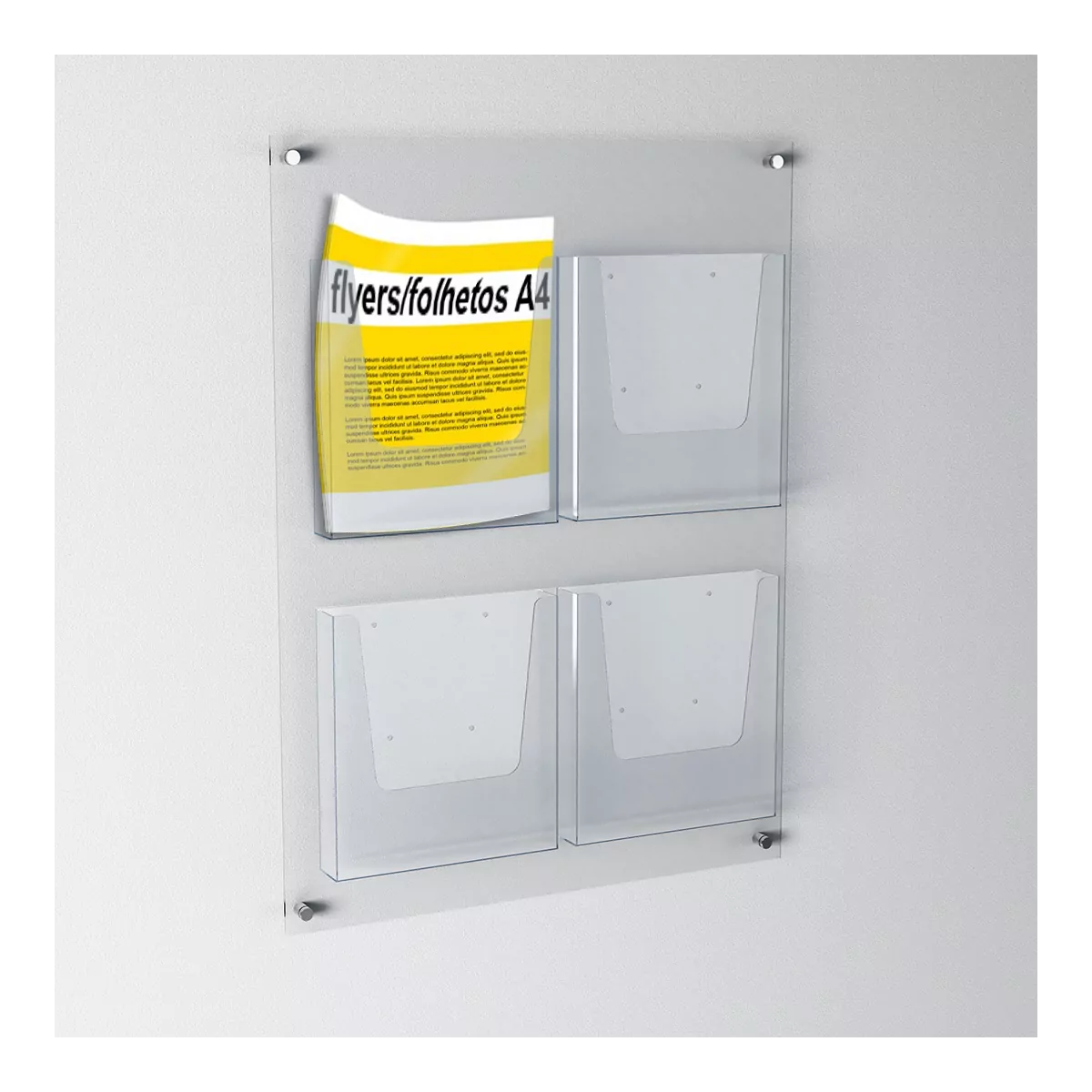 Placa em acrílico 3mm c/ 4 porta-folhetos A4 verticais.